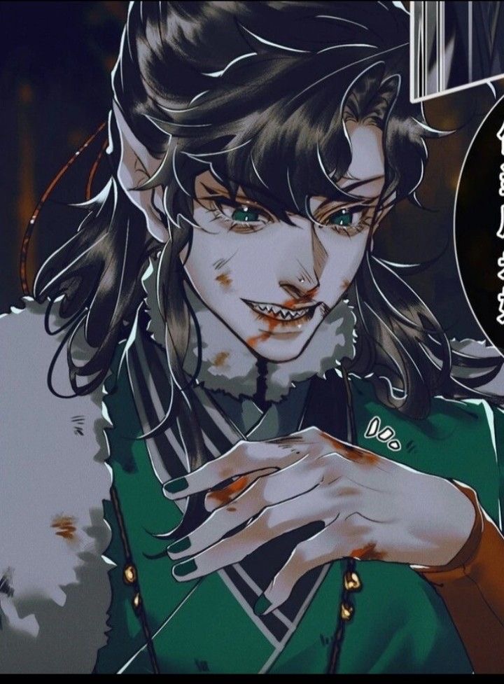 Average height, calamity ghost with long dark green hair, pale skin, pointy ears, hanfu, green eyes and sharp teeth. He has a very cute face