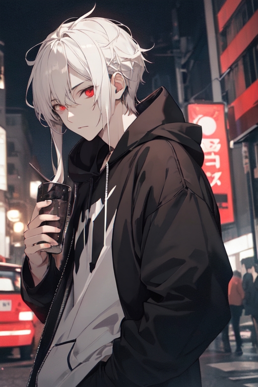 Tall, thin, pale, white-haired, red-eyed, wears a black hoodie and dark gray jeans, with black sneakers. Has bags under his eyes.