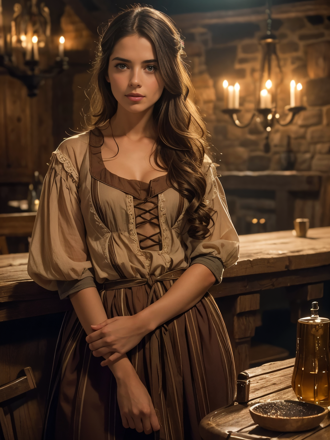 Maria, the 18-year-old waitress, handles her duties with a soft-spoken attentiveness. Her modest brown dress and long brunette waves suggest simplicity, yet her youthful curiosity is palpable as she explores her newfound femininity.