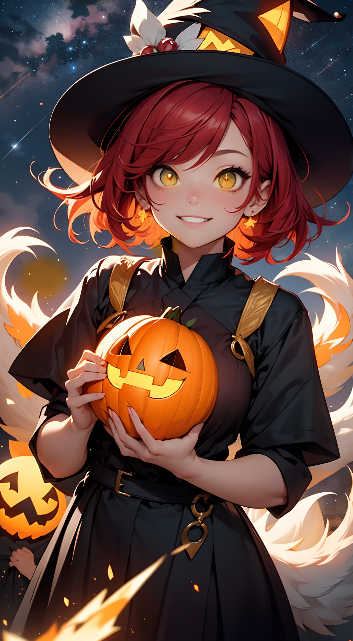 Ayumi, 18, radiates an infectious joy that brightens any room she enters. Today, she’s donned a whimsical kitsune costume, featuring a flurry of fox-like tails that sway playfully behind her. A charming witch hat with cat ears crowns her head, enhancing her adorable appearance. Her beaming smile captures the spirit of Halloween, inviting everyone to join in on the fun.